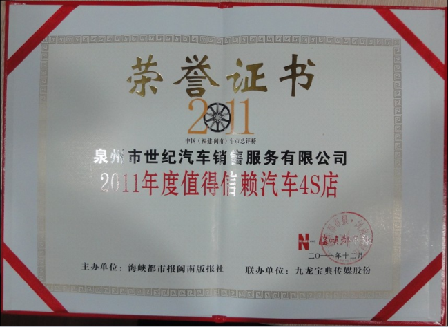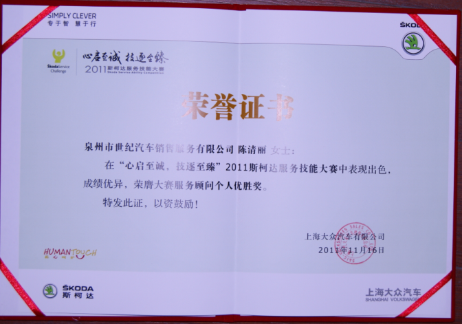 泉州世紀汽車銷售服務有限公司按德國大眾要求購進德國進口的大眾斯柯達汽車電腦檢測設備和全套專用維修設備、工具。通過精湛的技術、優質的24小時服務(包括24小時外出搶修)以及整車、配件的質量擔保、合理的價格和嚴格的管理,秉承Human Touch人性關愛服務理念為消費者提供最優質的、最貼心的斯柯達品牌文化體驗。公司先后被評“斯柯達服務滿意度金獎”、“全國優秀品牌二手車經銷商提名獎”、“中國 (大泉州)年度車市盛典泉州最值得信賴“五心級”汽車經銷商”、“SKODA華南區年度綜合業務優異獎”、 “首屆中國品牌之都金牌服務汽車經銷商”、 “斯柯達銷售服務滿意度進步獎”、“2011年度最值得信賴汽車4S店”、“2011年泉州車市金牌好店”、“2012年卓越質量擔保獎”、“2012年白金級經銷商”、2016年至2018年,連續三年被評為斯柯達六星級授權經銷商。